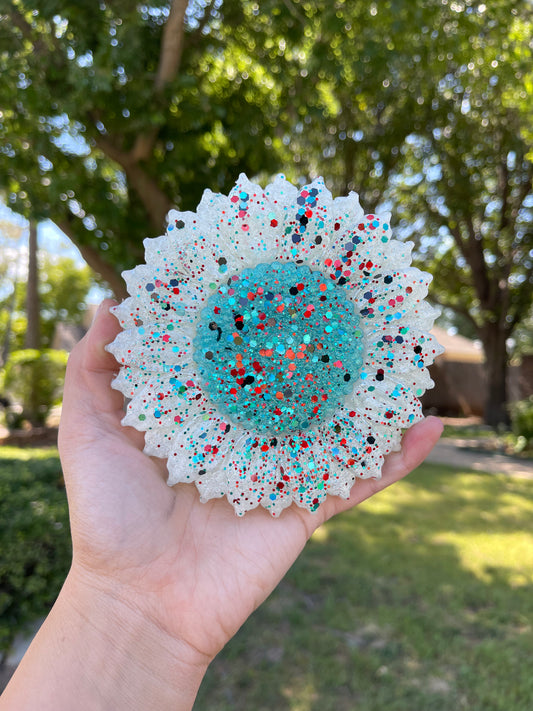 Rodeo Queen Glitter Sunflower (white outside, teal inside)